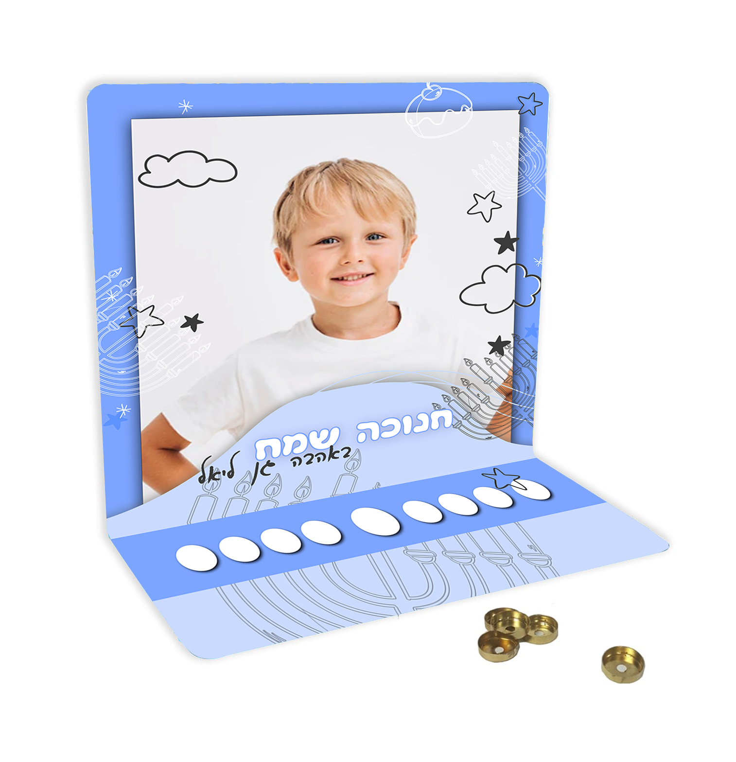 חנוכייה עומדת דגם מאלומיניום עם תמונה של הילד